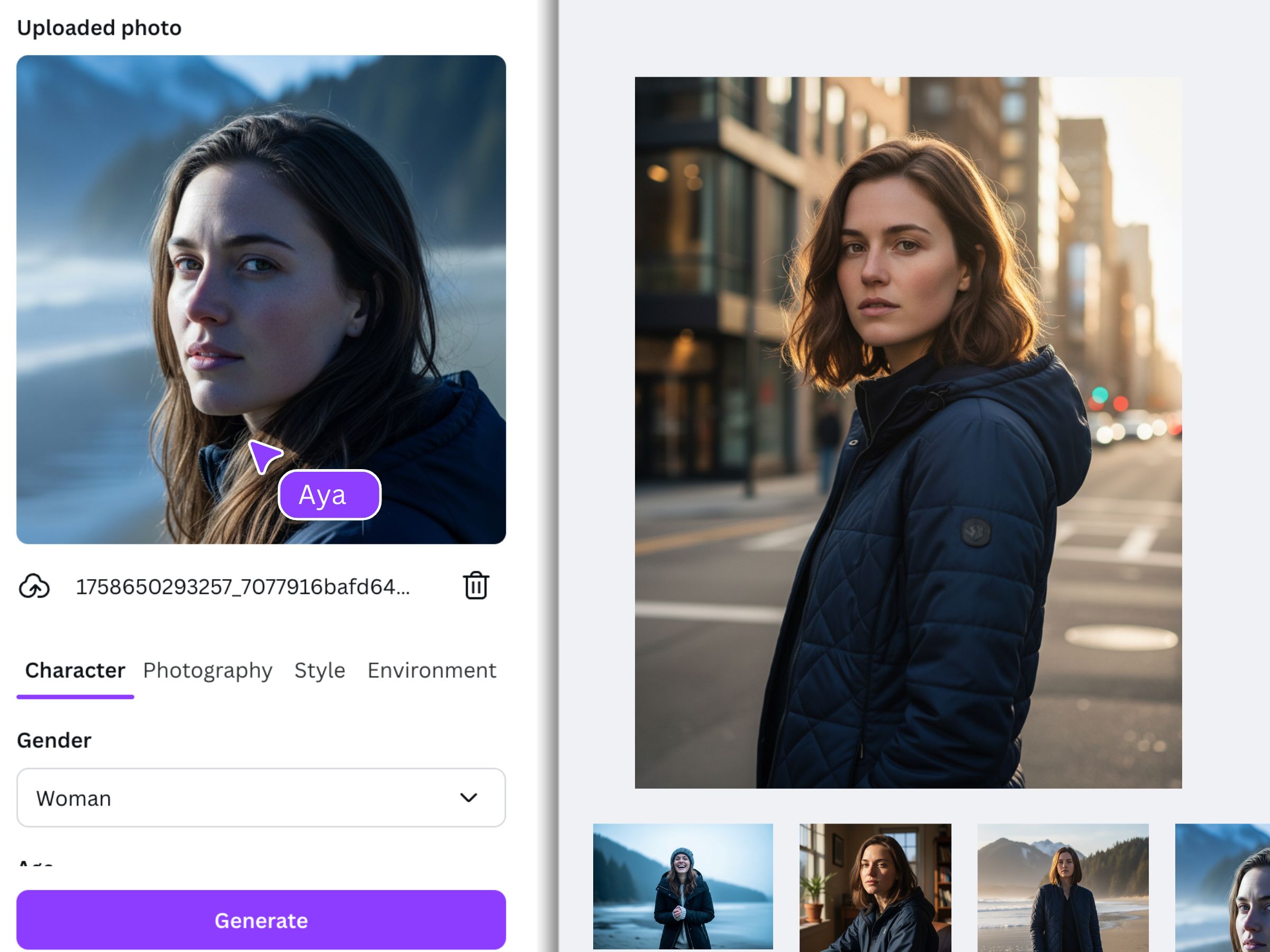 Professional AI photo studio with complete customization. Design character features, photography settings, artistic styles, and environments for personalized, studio-quality portraits.